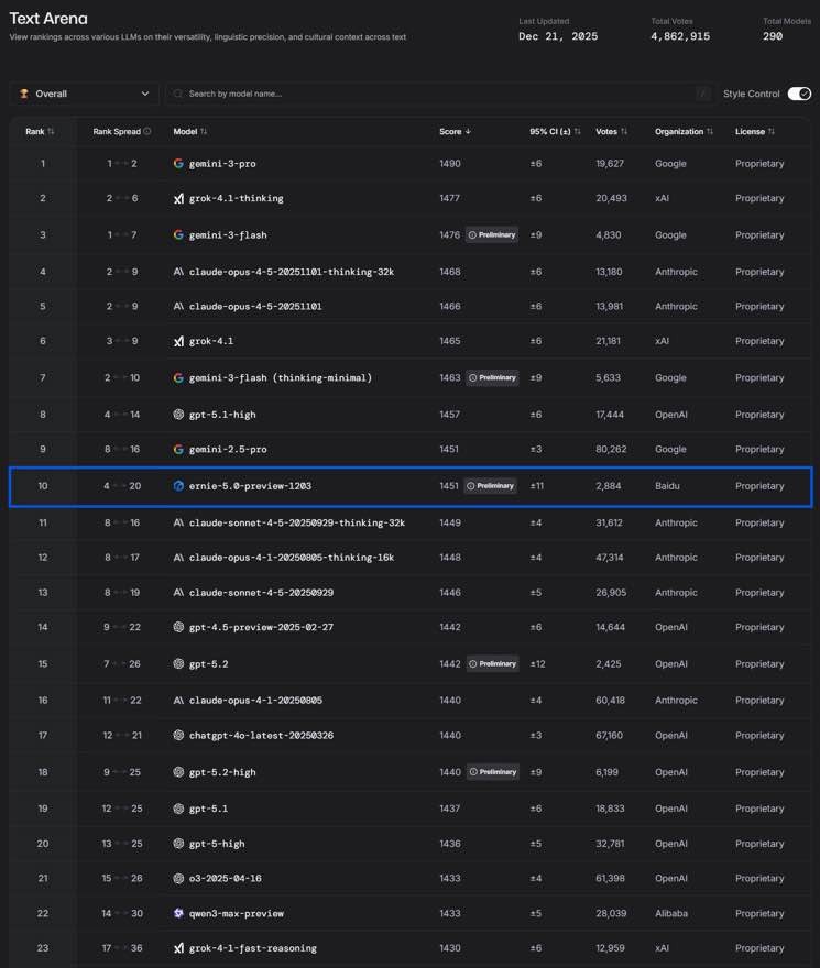 但就在12月23日,LMArena 大模子竞技场发布最新名次,文心新模子 ERNIE-5.0-Preview-1203 以 1451 分登上 LMArena 文本榜,名次中国第一,并到手杀进前10,是前20里独一的非好意思国模子,到手地冲破好意思国榜单的操纵。